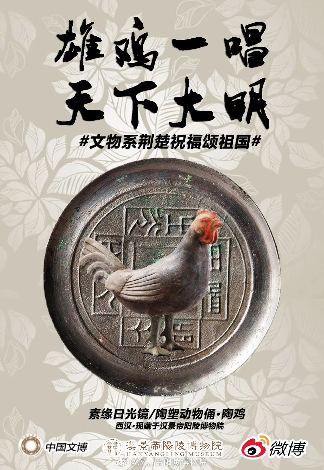 彩绘雄鸡长16.4厘米、高14.4厘米,为灰陶质,通体彩绘。素缘日光镜直径6.85厘米。背面无锈饰,为水银光,弓形钮,方座,方座四面以凸线构成的对称长方形分布,共有“见日之光,天下大明”八字铭文。“雄鸡一唱”意味着天明,象征黑暗离去,“天下大明”。愿战疫早日胜利,所有人都平平安安。
