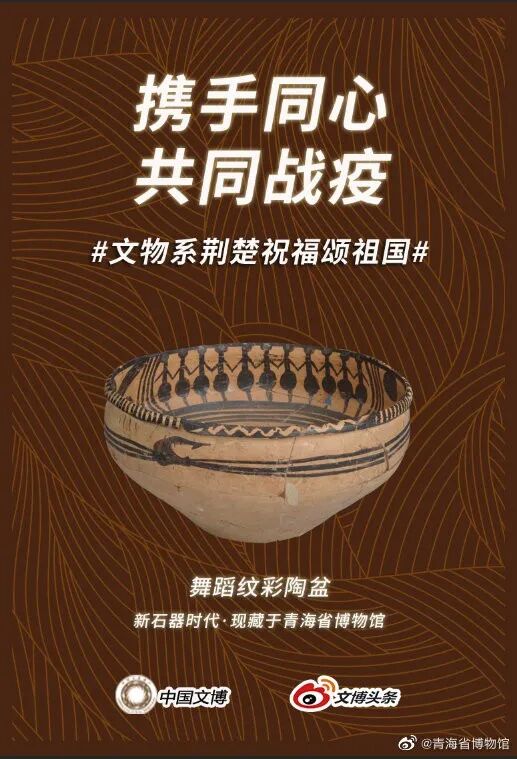 该物出土于青海省海南藏族自治州同德县宗日遗址,属于新石器时代马家窑类型,距今 5000 多年。两组手拉手跳舞的人们,一组十三人,一组十一人,像是人们围绕着篝火在夕阳下的身影,拉起手顿足为节,连臂踏歌。待疫情结束,我们仍然会拉起手跳着人类原始纯真的舞姿,携手同心,勇毅笃行 。