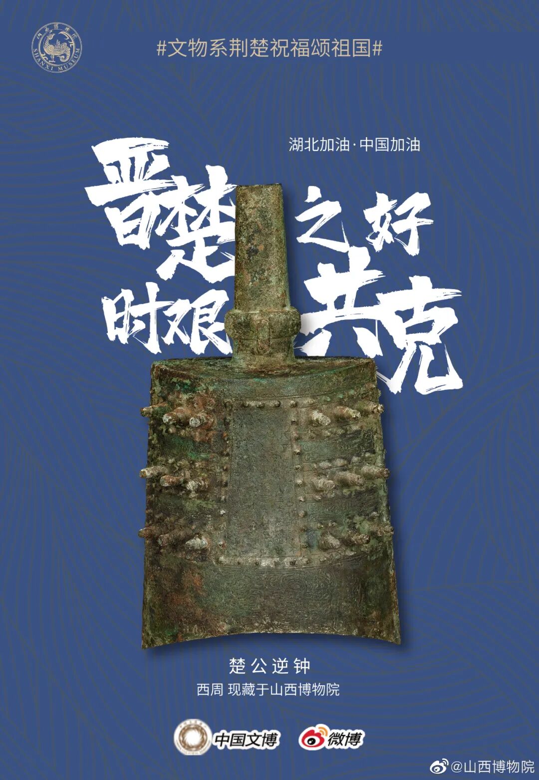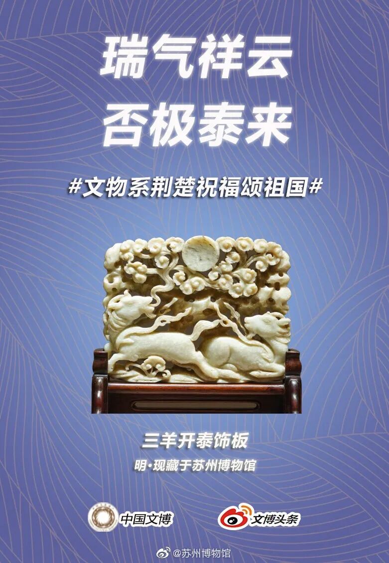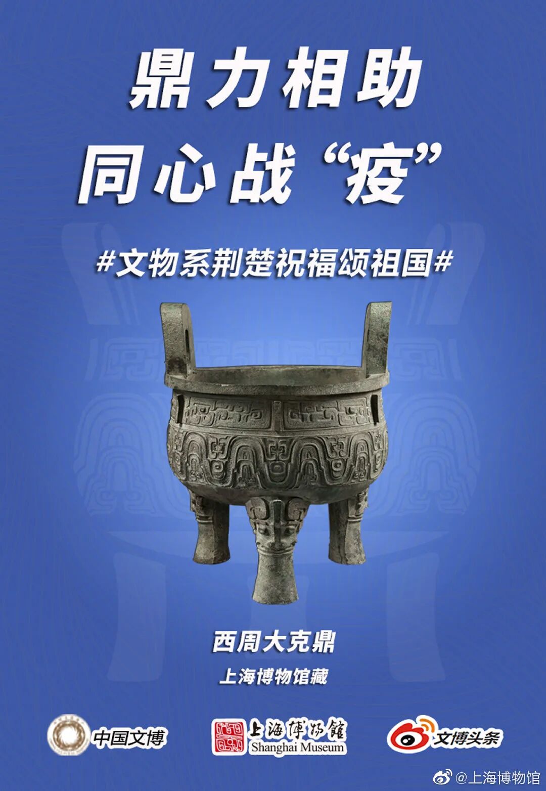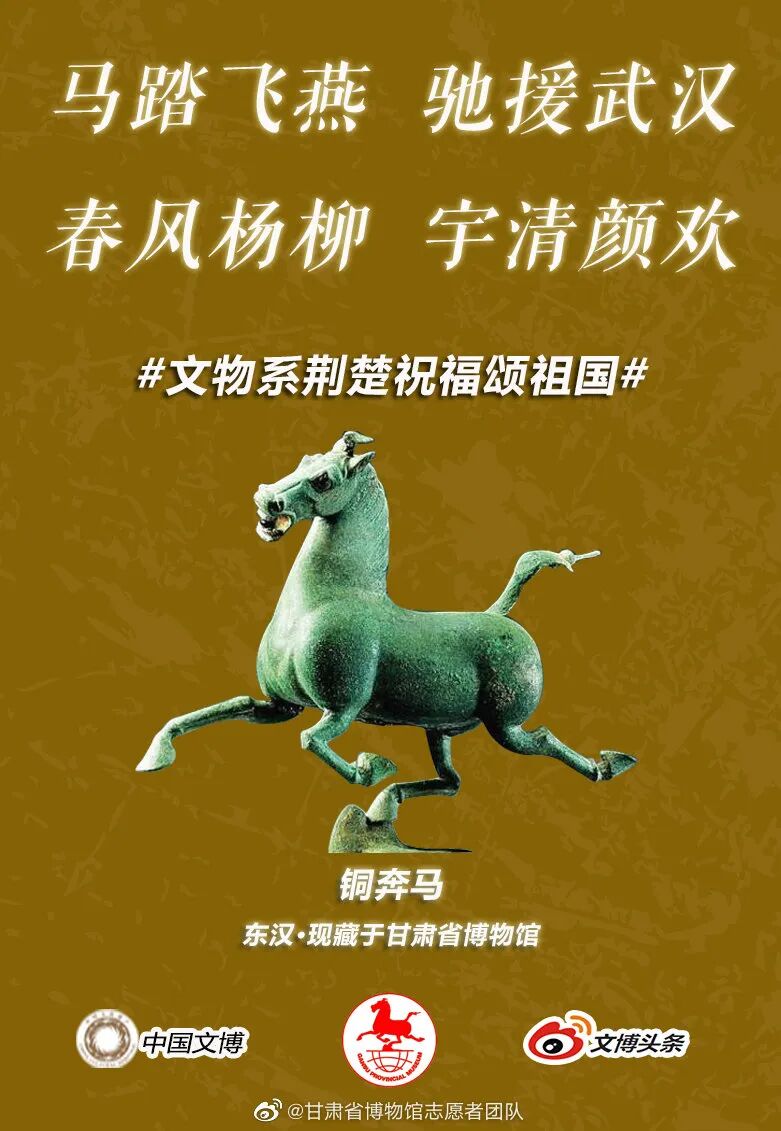 马踏飞燕驰援武汉的“铜奔马”、同舟共济的“清雕白玉船”,战疫伏魔的“青铜宝剑”,鼎力相助的“西周大克鼎”......2020年年初,新冠肺炎疫情肆虐全国之际,微博联合@中国文博 及海内外100多家文博机构组织开展“文物系荆楚 祝福颂祖国”祝福接力活动,各地博物馆纷纷拿出镇馆之宝,制作成精美海报,中华瑰宝接力鼓劲,用五千年文化底蕴为抗疫行动汇聚精神力量,通过丰富的文物展示传递美好的祝福和必胜的信念。