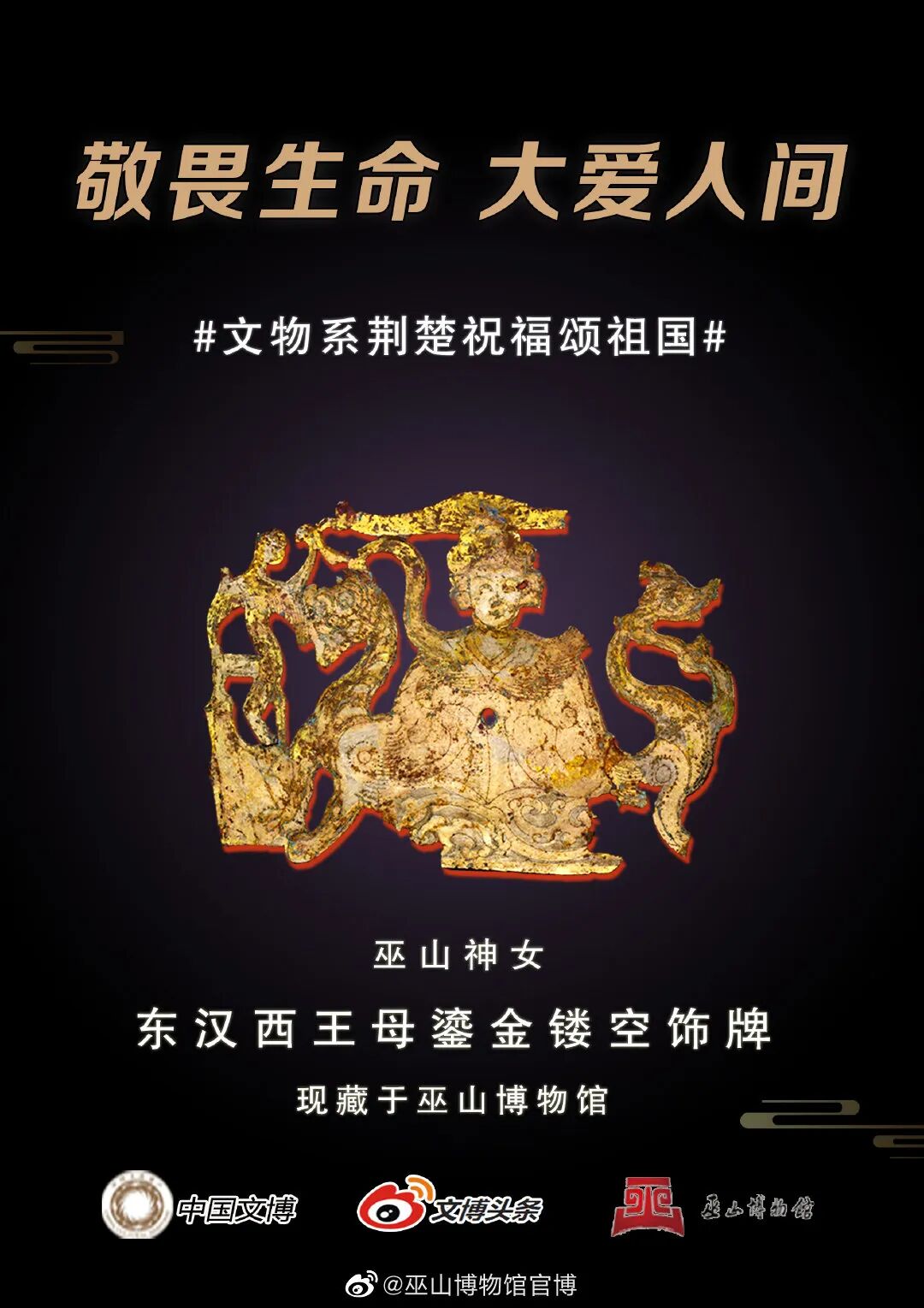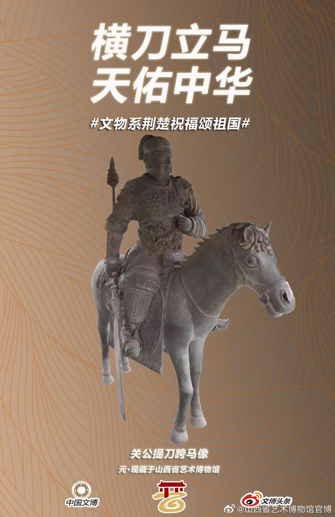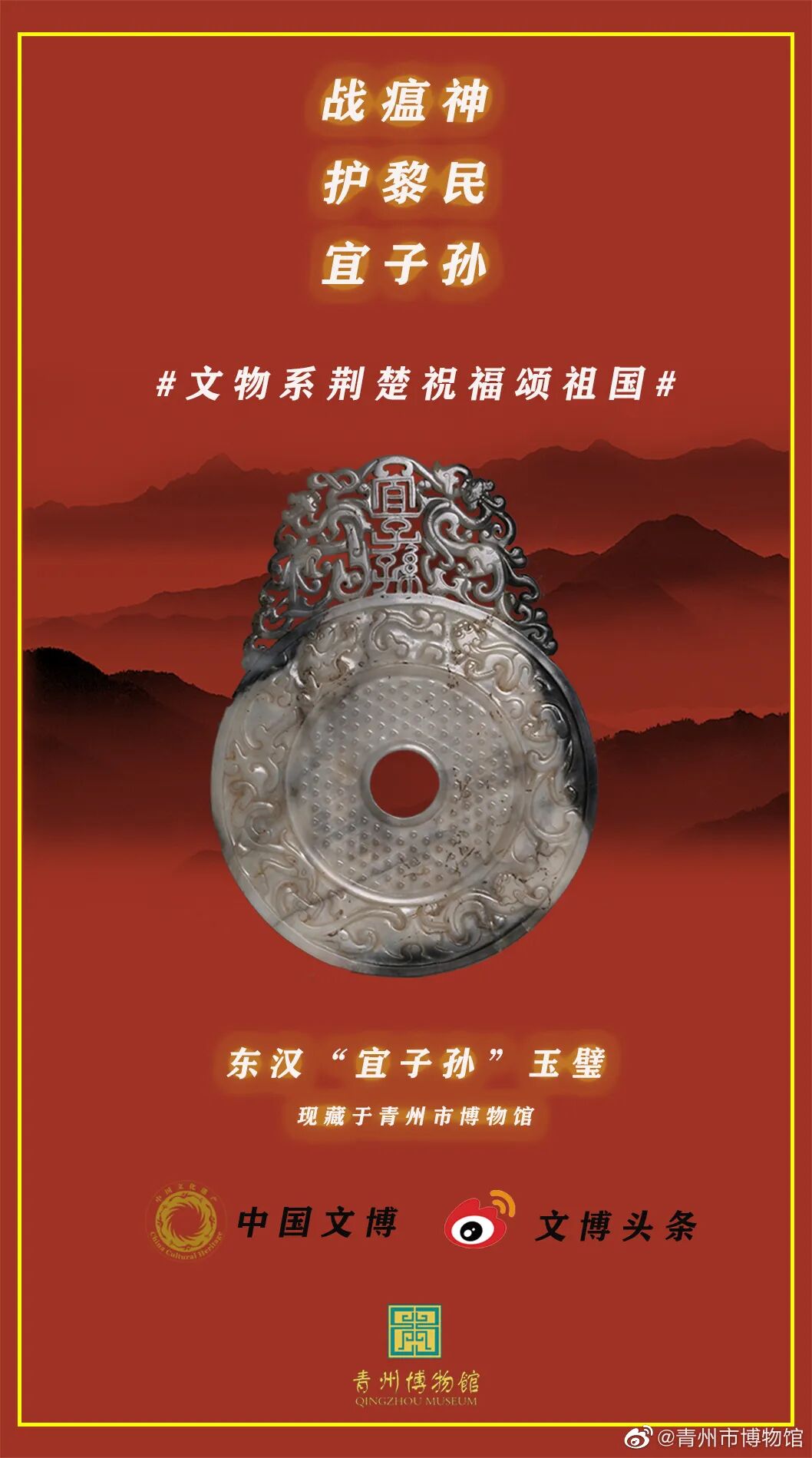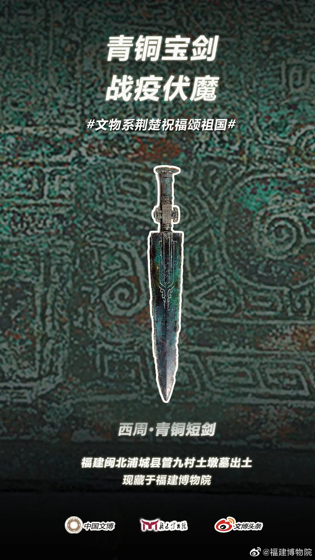 马踏飞燕驰援武汉的“铜奔马”、同舟共济的“清雕白玉船”,战疫伏魔的“青铜宝剑”,鼎力相助的“西周大克鼎”......2020年年初,新冠肺炎疫情肆虐全国之际,微博联合@中国文博 及海内外100多家文博机构组织开展“文物系荆楚 祝福颂祖国”祝福接力活动,各地博物馆纷纷拿出镇馆之宝,制作成精美海报,中华瑰宝接力鼓劲,用五千年文化底蕴为抗疫行动汇聚精神力量,通过丰富的文物展示传递美好的祝福和必胜的信念。