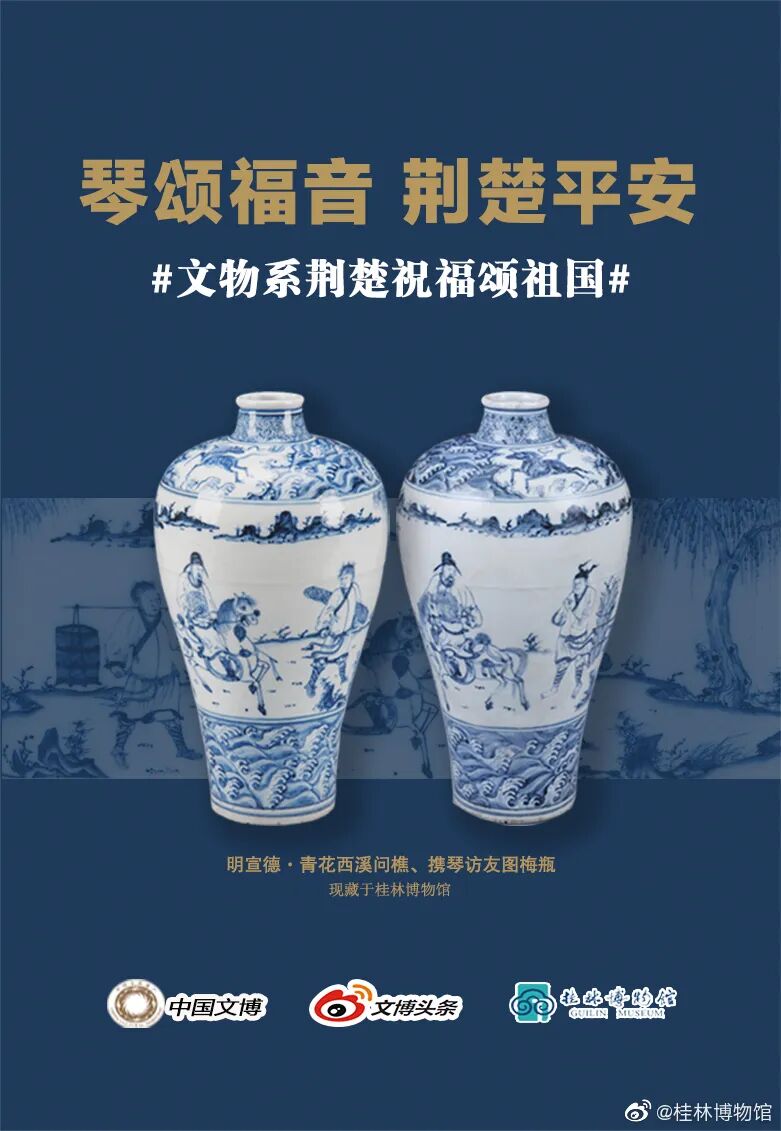 1972年出自桂林市东郊明代靖江安肃王朱经扶夫妇合葬墓,腹部主题纹饰描绘俞伯牙、钟子期高山流水遇知音的故事。春秋时期,伯牙、子期在荆楚汉阳之畔相遇相知,此后这份深厚的友谊在华夏大地传唱千年而经久不衰。古有伯牙为知己封琴绝弦,今有武汉为中国封城抗疫,人间的真情如播种般传递、续写!
