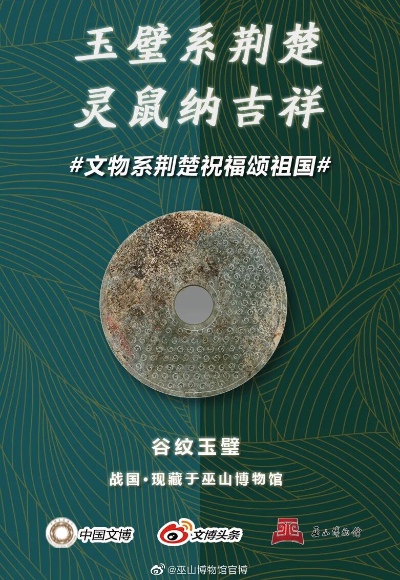 玉璧直径17.4cm,穿径3.6cm,厚0.7cm,青绿色玉质,圆形扁体中空状,肉宽于好,阴线刻出内外廓,肉内满饰谷纹。远古的巫山,地处峡江,农渔业生产多取决于天气,先民们期望通过天圆、青色(苍色)的玉璧祭天,来表达对天的崇敬、依赖之情。玉壁上有成排的密集小乳丁,雕成涡旋状,象征着万物苏醒、生机勃勃的景象。